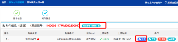 2.2 在“教学与科研管理”中选择“医学研究伦理申请”并按要求完成所需填写内容(部分栏目在填写框内有参考内容,可以引用),相关附件中“伦理承诺书”为必填项,请下载模板,认真填写后签字扫描上传。