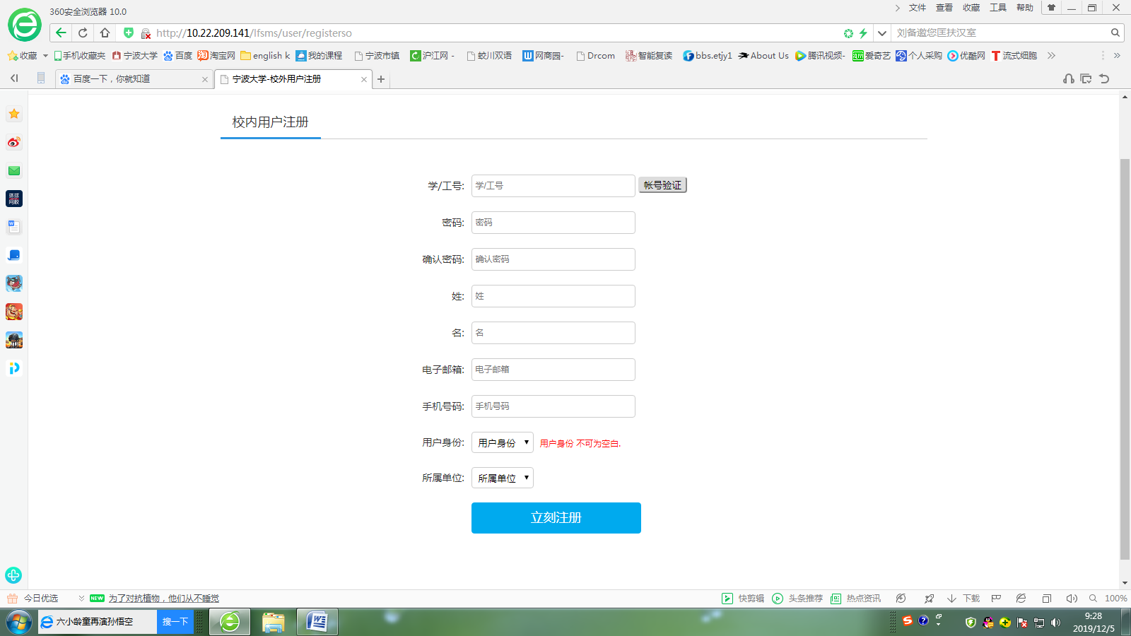 3. 完成注册页面的填写,工号为各位老师的宁波大学与中国银行联名的教工卡背面的卡号。输入卡号之后,点击账号验证,系统会自动填入一些信息。剩下部分请全部补充完整。点击立即注册。